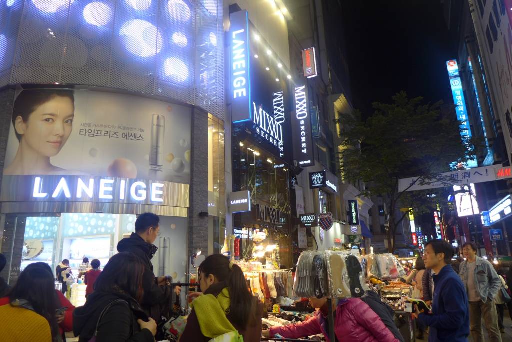 位於首爾中心,周圍擁有樂天、新世界等百貨公司及各種大型購物中心,主要街道內聚集了各式品牌名店、流行服飾及韓系彩妝店等,巷弄內還有各類特色小店、攤販跟道地小吃等,應有盡有,吸引眾多購物觀光人潮。