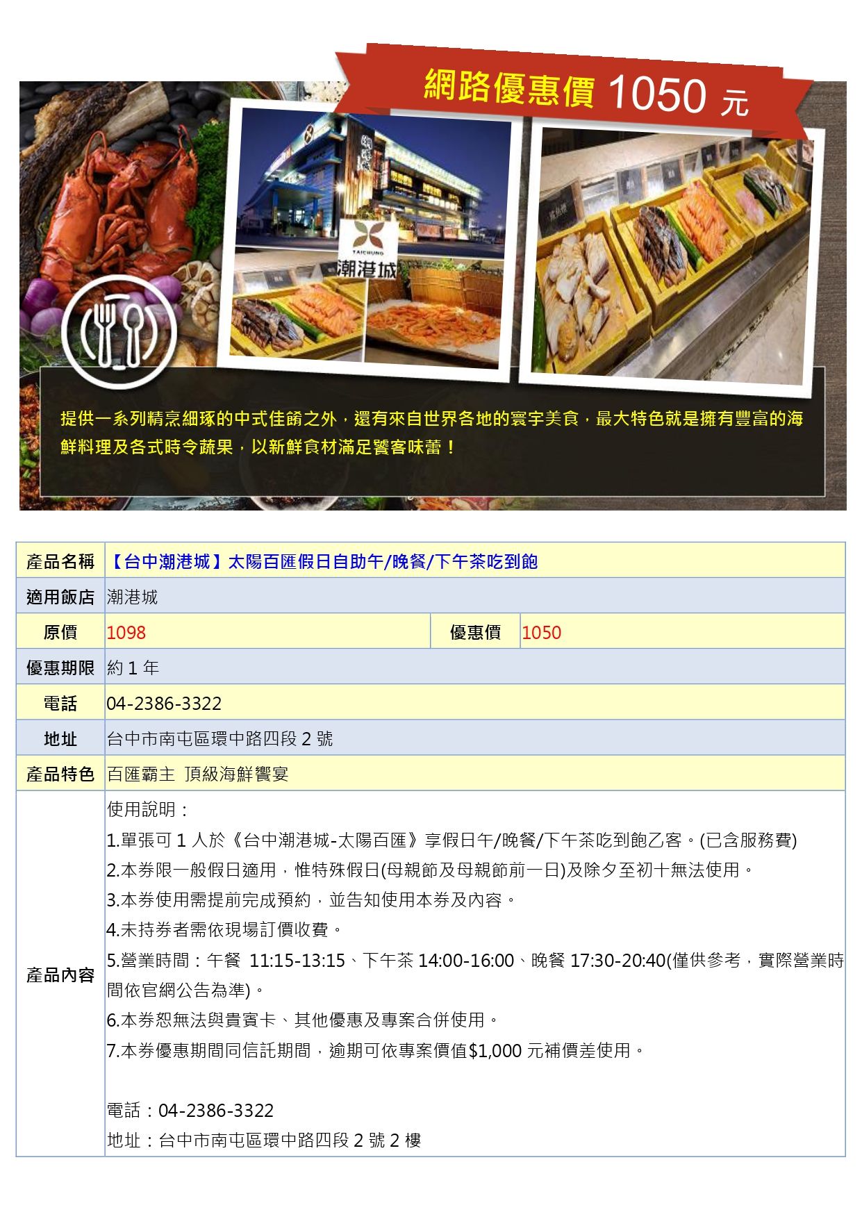 【台中】潮港城太陽百匯假日自助午/晚餐/下午茶吃到飽