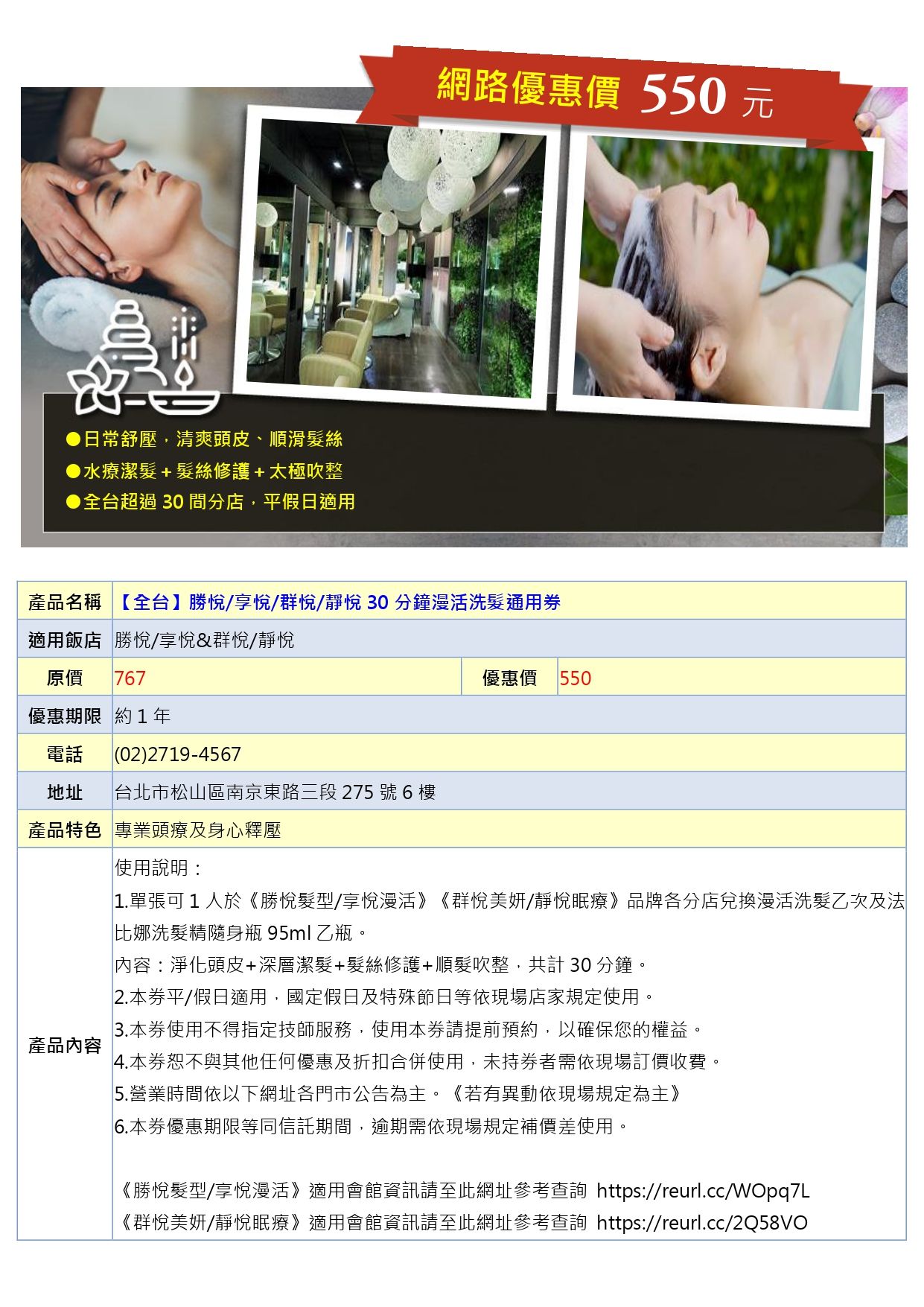 【全台】勝悅/享悅/群悅/靜悅30分鐘漫活洗髮通用券