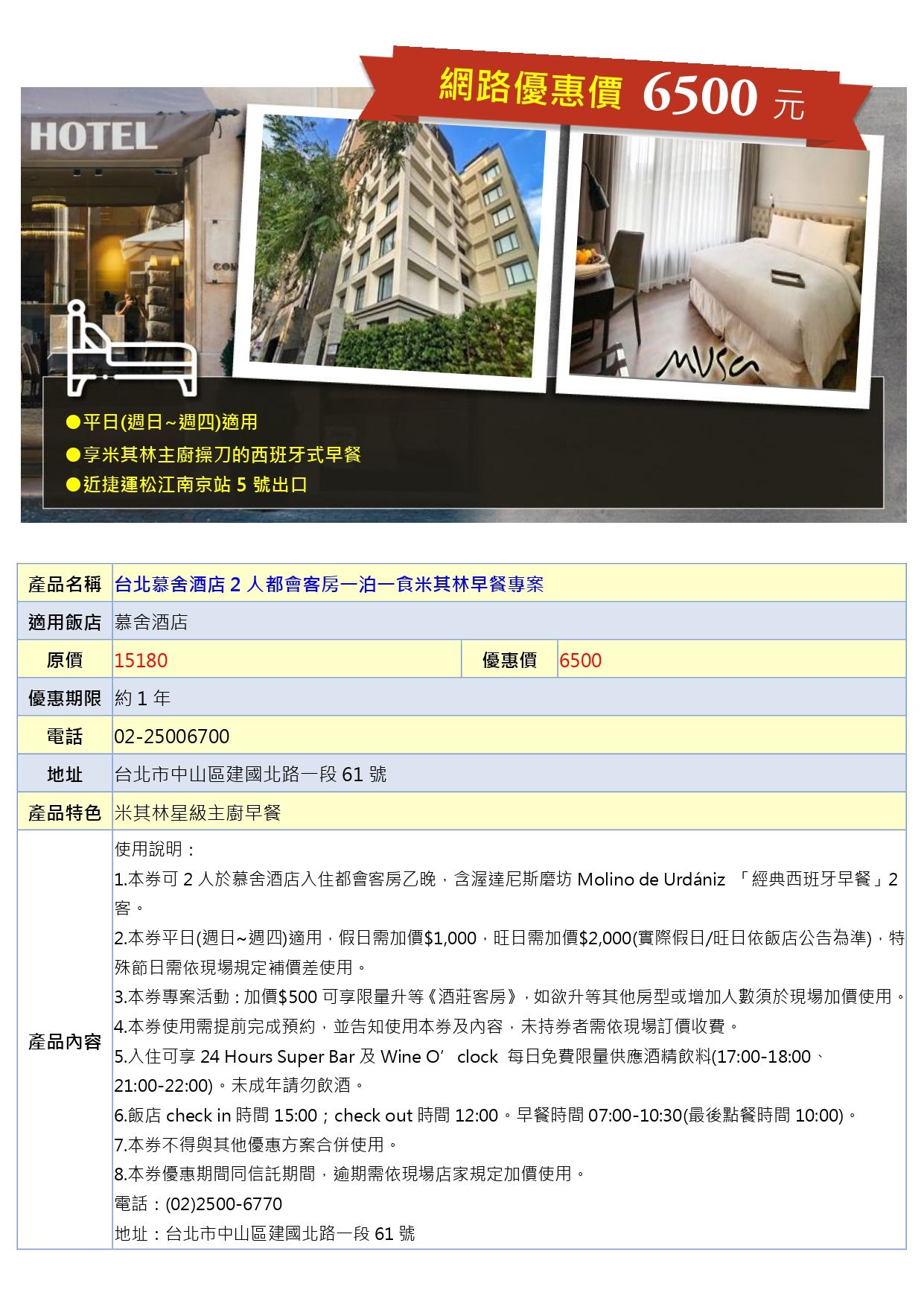 【台北】慕舍酒店2人都會客房一泊一食米其林早餐專案