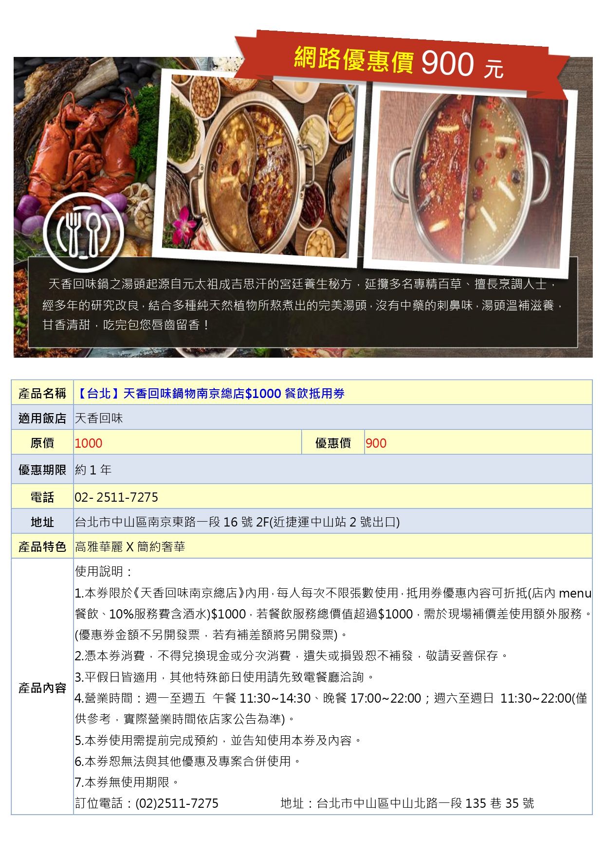 【台北】天香回味鍋物南京總店$1000餐飲抵用券