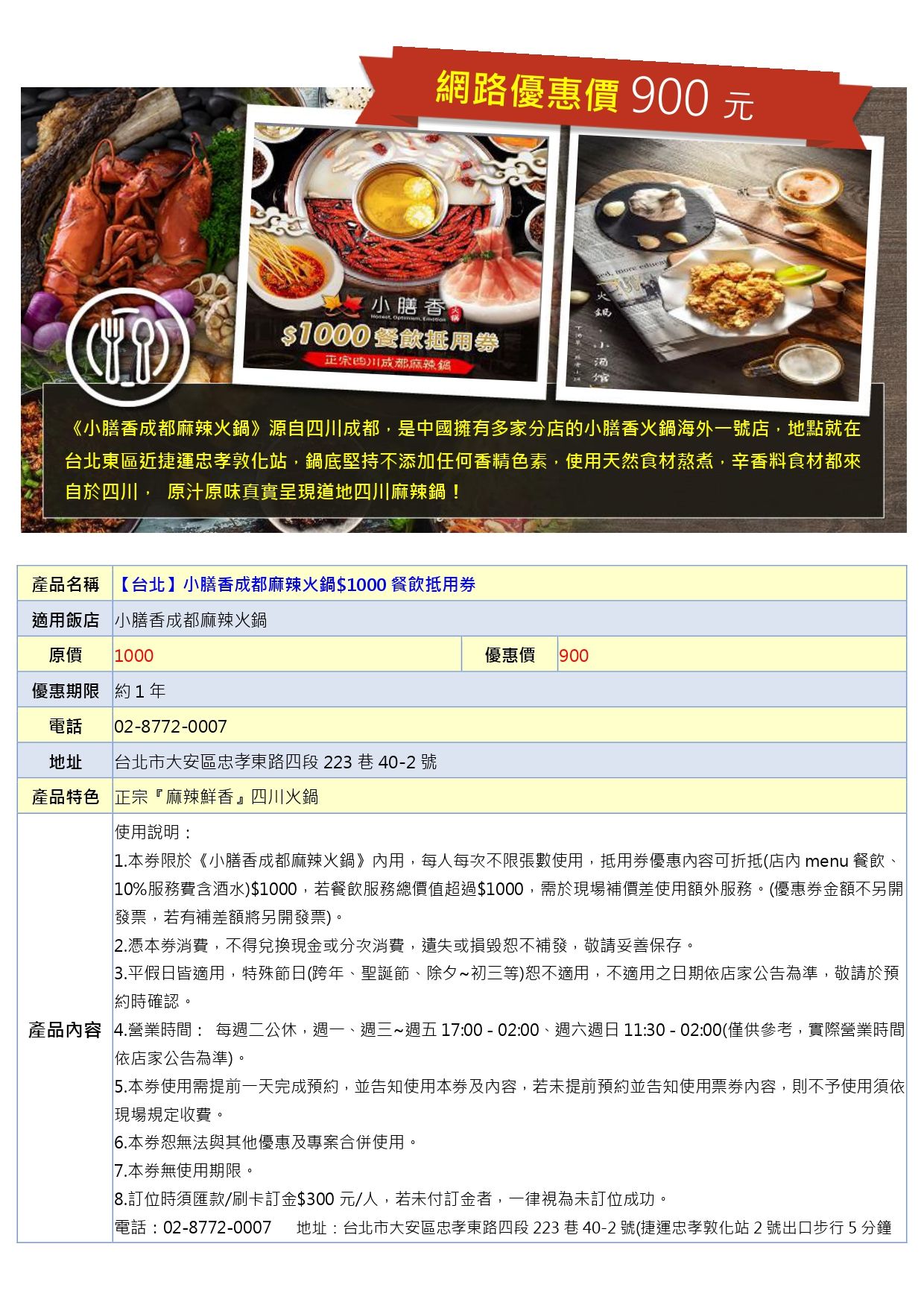 【台北】小膳香成都麻辣火鍋$1000餐飲抵用券