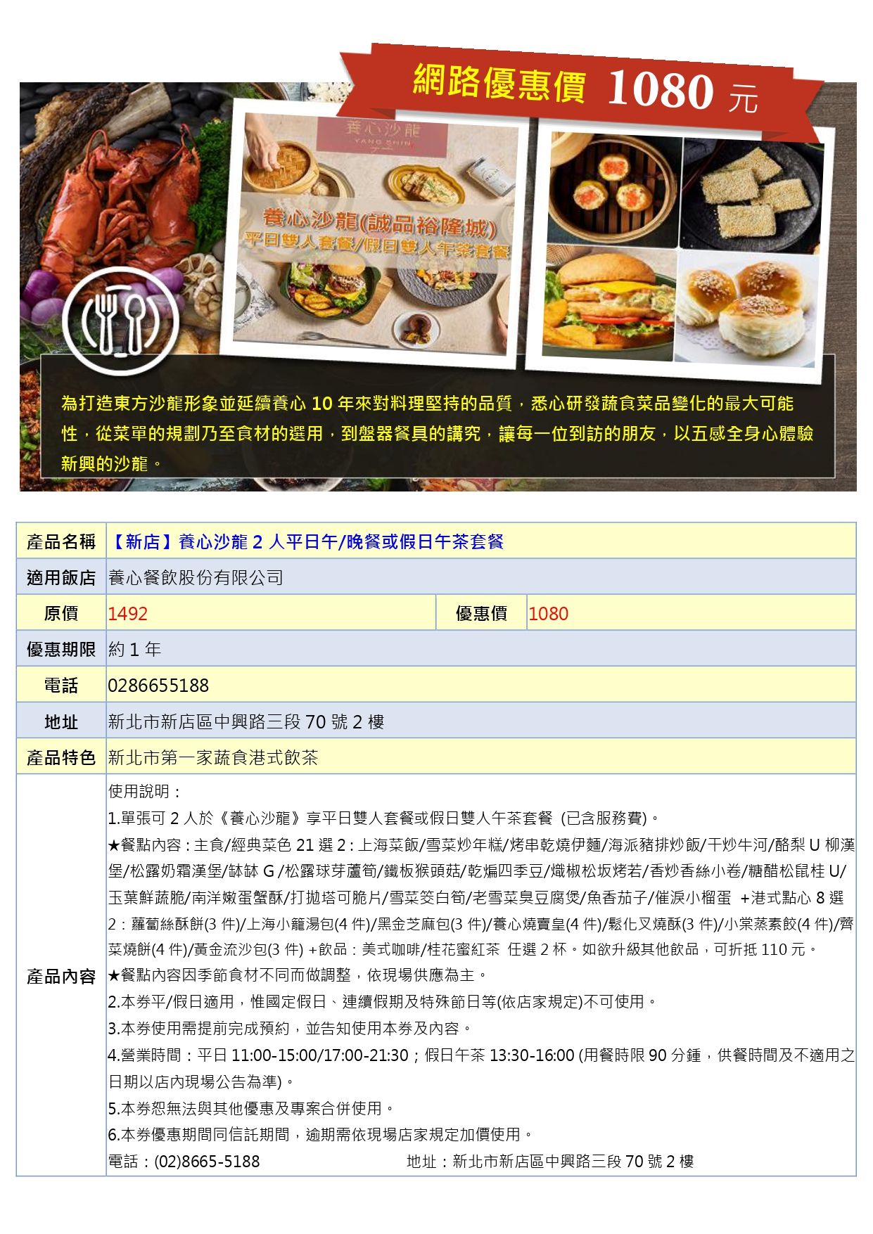 【新店】養心沙龍2人平日午/晚餐或假日午茶套餐