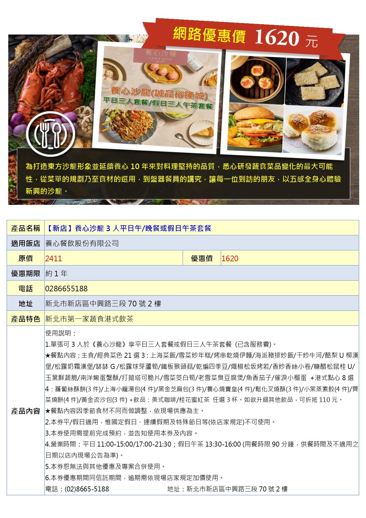 【新店】養心沙龍3人平日午/晚餐或假日午茶套餐