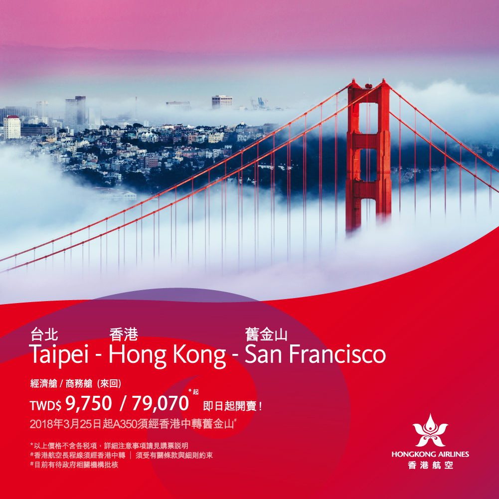 香港航空將於2018年3月25日起,正式開航美國舊金山航線服務