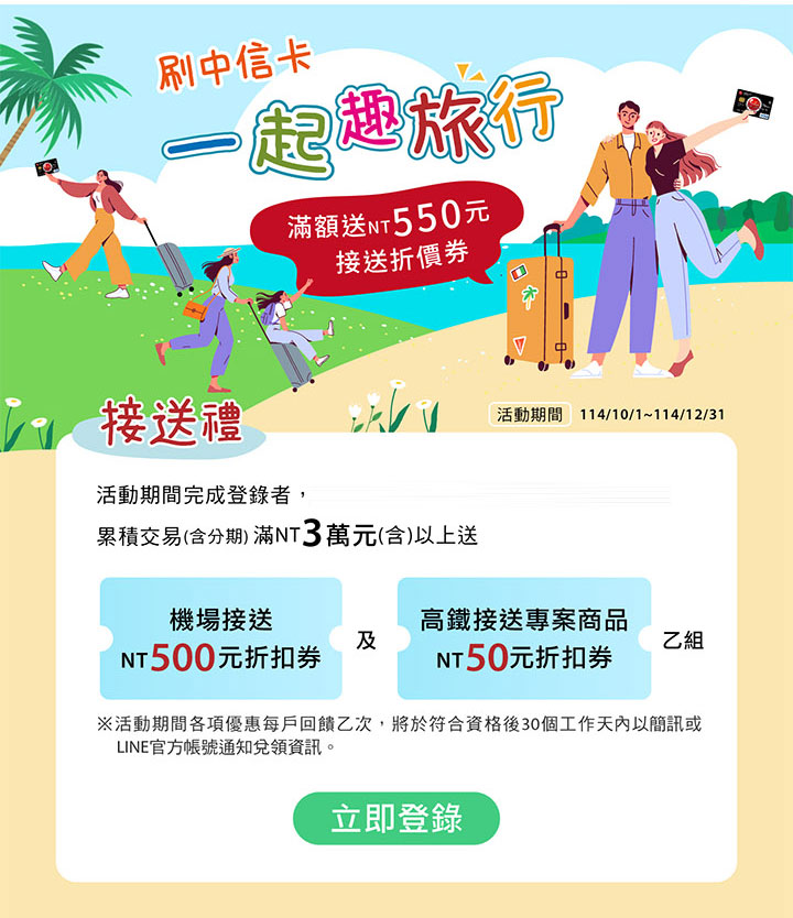 活動期間符合回饋名單將依成功登錄且優先符合活動門檻之排序作為回饋依據,【接送禮】每一歸戶每項贈品限回饋乙次。