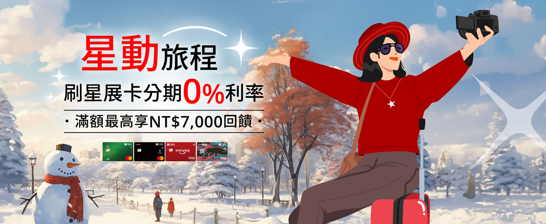 - 1.本活動限於指定特約旅行社刷星展信用卡分期消費達指定門檻,並於指定期間內完成登錄,即可參加本活動。本活動正附卡消費合併計算,月月消費、月月回饋,每月每一正卡持卡人(以身分證字號歸戶)限擇優回饋乙次,恕不跨門檻重複回饋。